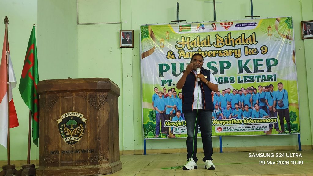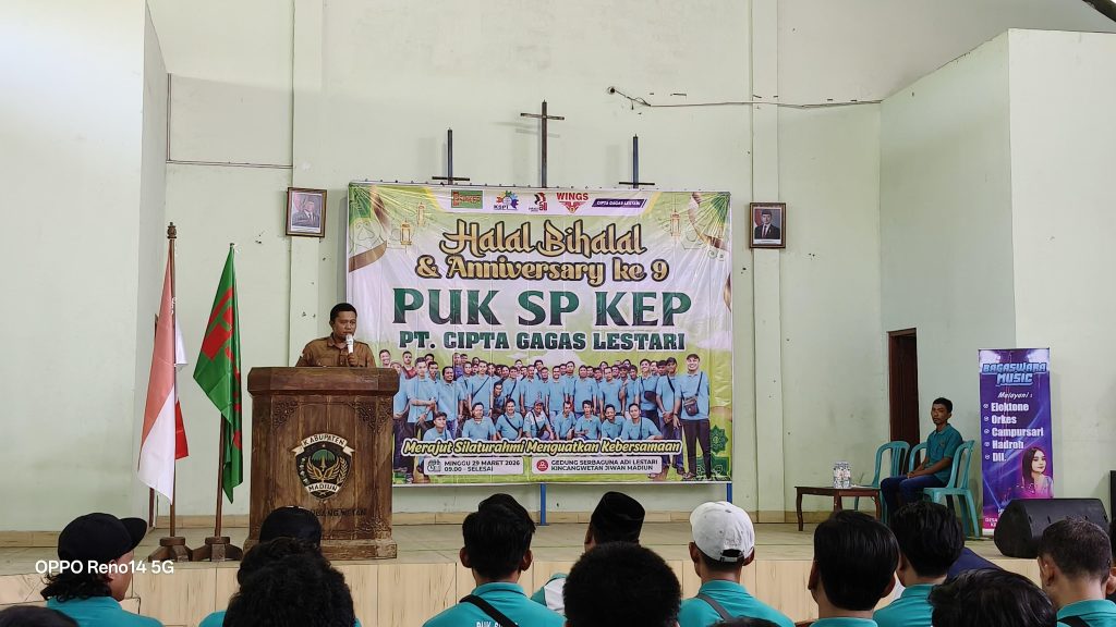 Madiun, Media Suarapergerakan.id | Pengurus, anggota, serta jajaran pimpinan Serikat Pekerja mengadakan kegiatan di Gedung Adi Lestari, Madiun, pada hari Minggu, 29 Maret 2026. Mereka hadir dalam acara Halal Bihalal sekaligus perayaan Hari Jadi Serikat Pekerja PT. Cipta Gagas Lestari yang ke-9 tahun. Kegiatan yang berlangsung meriah ini menjadi momen penting untuk mempererat tali silaturahmi sekaligus memperkuat komitmen organisasi dalam memperjuangkan hak-hak pekerja.