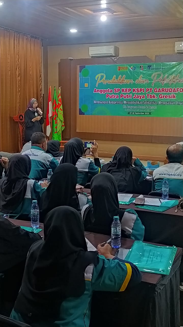 Mojokerto, suarapergerakan.id 27 September 2025 — Serikat Pekerja Kimia Energi dan Pertambangan Konfederasi Serikat Pekerja Indonesia (SP KEP KSPI) PT Garudafood kembali menggelar pendidikan dan pelatihan anggota yang bertempat di Arayana Hotel & Resort, Trawas, Mojokerto. Kali ini, materi yang diangkat adalah Pengenalan Anggaran Dasar dan Anggaran Rumah Tangga (AD/ART) organisasi serta Perjanjian Kerja Bersama (PKB) perusahaan.